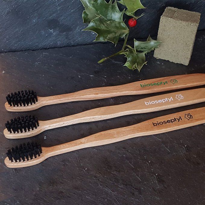 Brosse à dents de taille adulte en hêtre, prise en main et utilisation agréables et efficaces. 100% écologique et biodégradable, ses poils sont fabriqués à base de fibres végétales.